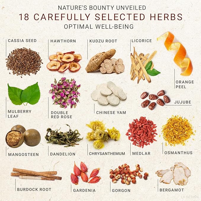 Every ingredient is a testament to nature's healing power. From the clarifying Cassia Seed to the rejuvenating Goji Berry and the soothing Chrysanthemum, each of these 18 carefully selected herbs plays a vital role in nurturing your liver. Our formula is rooted in the wisdom of Traditional Chinese Medicine (TCM), where herbs are blended in synergy to restore balance and vitality to the body. No additives, no caffeine—just pure herbal goodness.