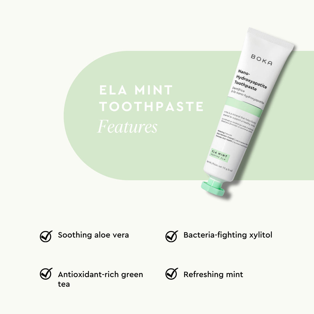 Upgrade your oral care with Ela Mint, powered by nano-hydroxyapatite for stronger enamel, reduced sensitivity, and a naturally whiter smile. Infused with soothing aloe vera, antioxidant-rich green tea, bacteria-fighting xylitol, and refreshing mint, it delivers a clean, fresh, and fluoride-free brushing experience. Smarter science, healthier teeth